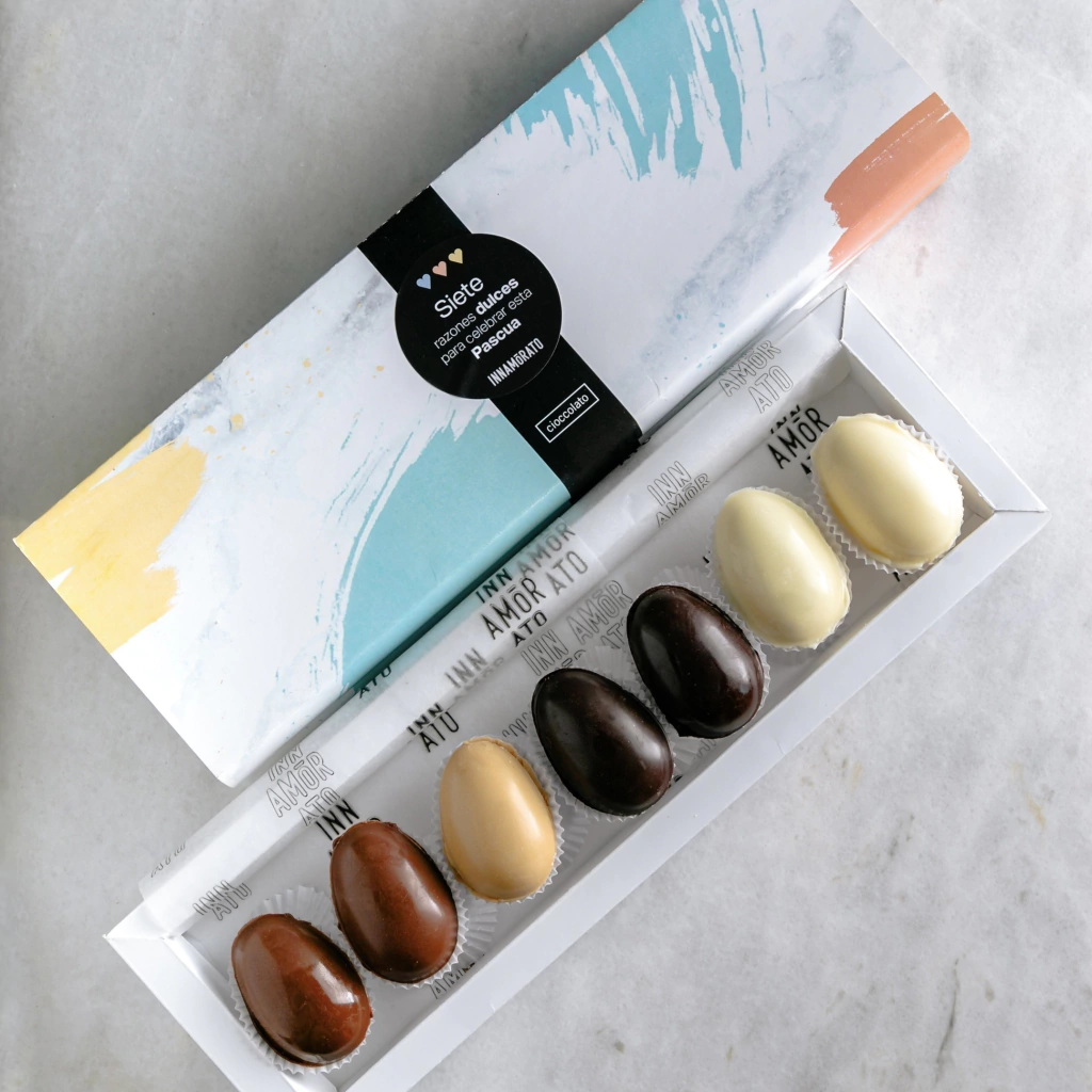Caja de 7 Huevitos de Pascuas: 2 choco blanco; 2 choco semiamargo; 2 choco leche y 1 choco caramel.