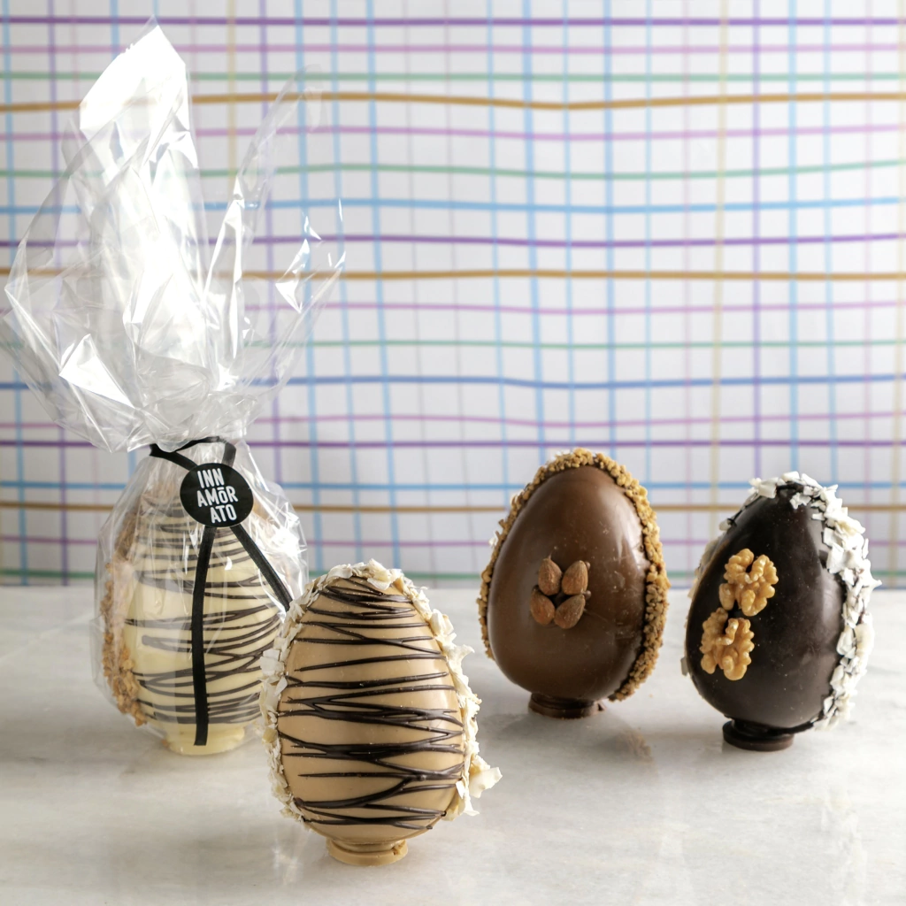 Huevo Pascuas de Chocolate con un peso aproximado de 200 gr. relleno de bombones. 4 variedades disponibles: Chocolate Leche; Chocolate Semiamargo; Chocolate Caramel y Chocolate Blanco.